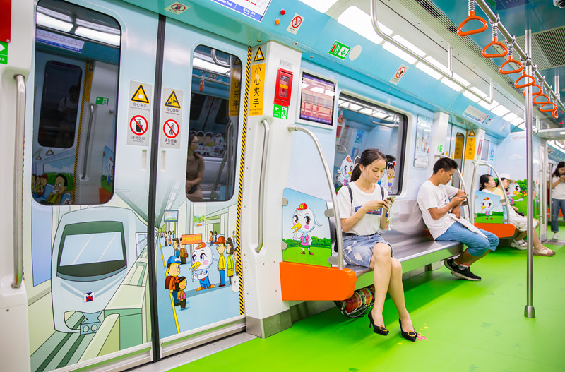 “一进来就觉得这片绿色很清新,卡通图案很可爱。”市民李女士每天乘坐1号线从塘边站到镇海路站上班,在她看来,这趟地铁车厢设计“高大上”,宣传内容则很接地气,每一幅主题宣传画仿佛讲述的就是她身边的事。
