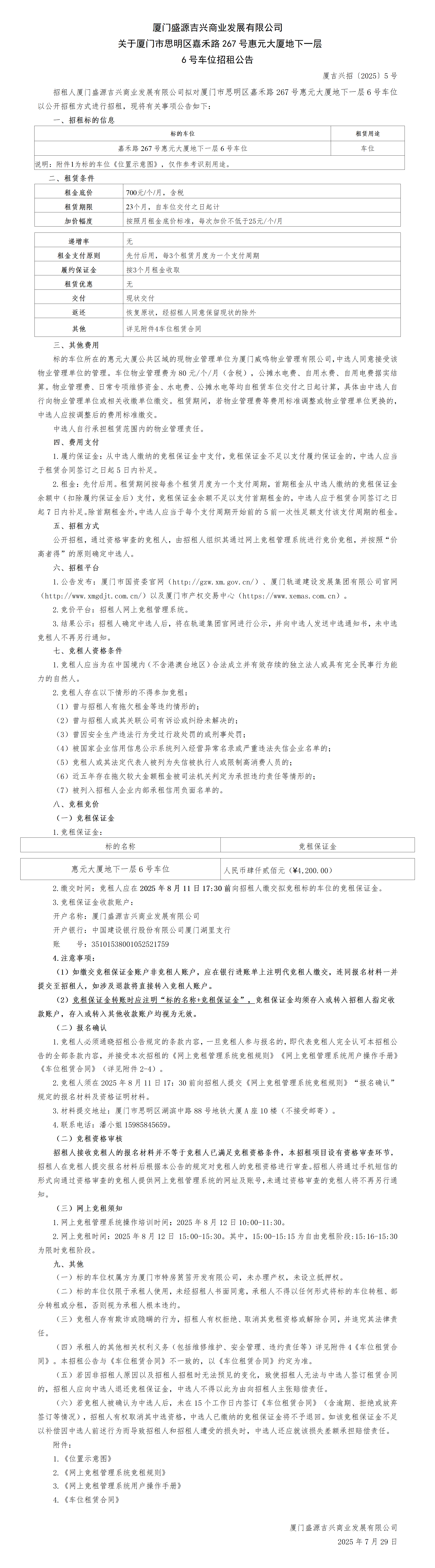 关于厦门市思明区嘉禾路267号惠元大厦地下一层6号车位招租公告
