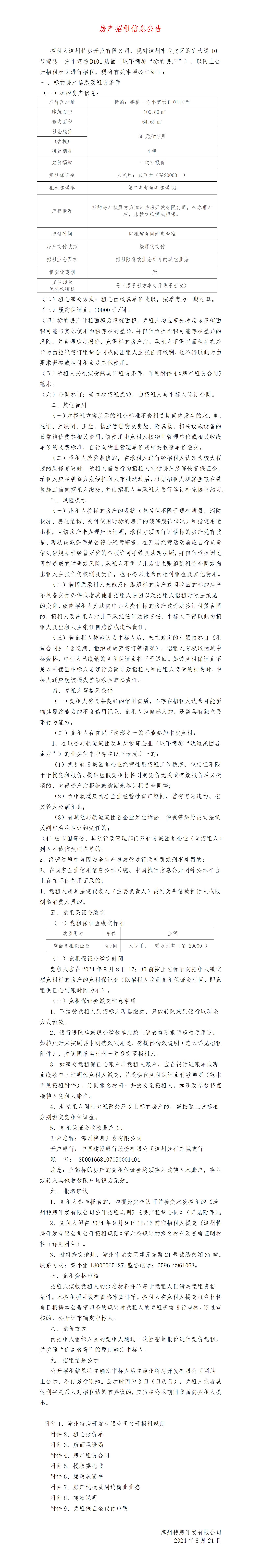 漳州特房开发有限公司房产招租信息公告