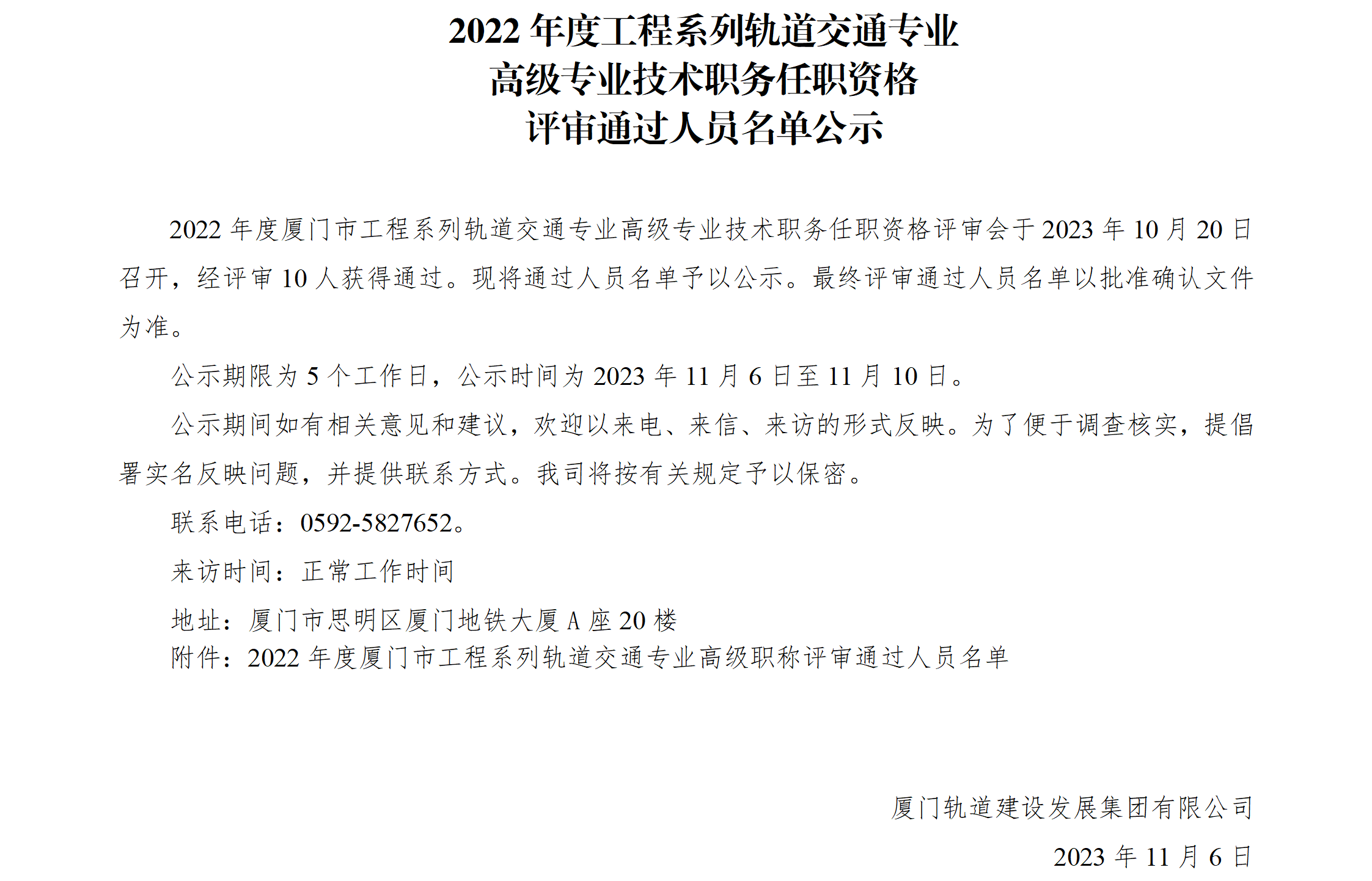 2022年度工程系列轨道交通专业高级专业技术职务任职资格评审通过人员名单公示