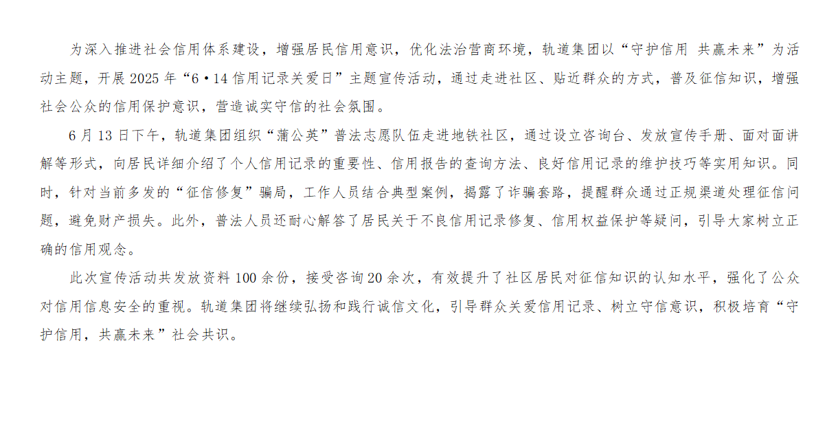 强化信用意识 筑牢诚信根基——轨道集团开展“6.14信用记录关爱日”诚信宣传活动