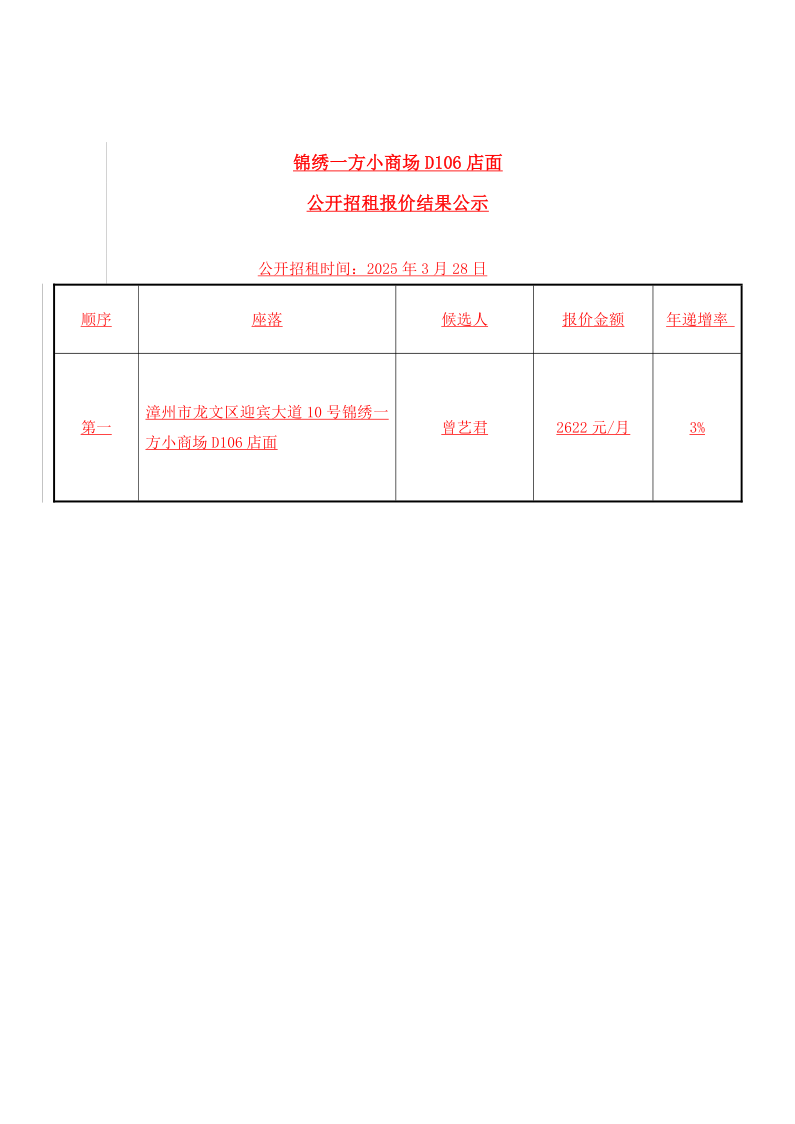 漳州特房开发有限公司锦绣一方小商场D106店面公开招租报价结果公示