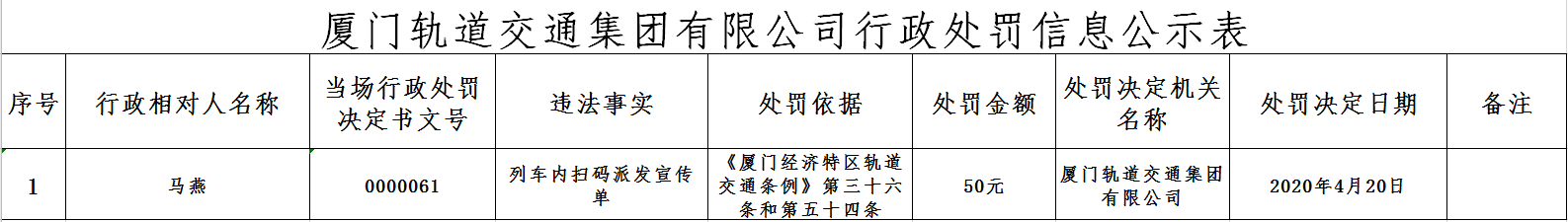 厦门轨道交通集团有限公司行政处罚信息公示(2020.4.21-2020.4.27)