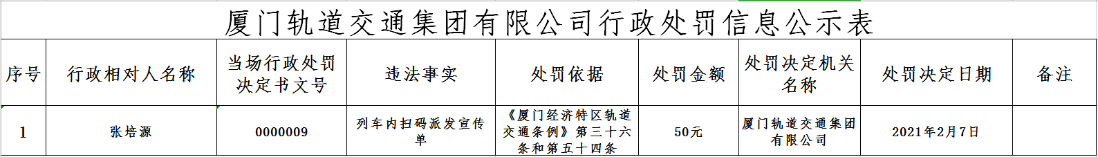 厦门轨道交通集团有限公司行政处罚信息公示(2021.2.7-2021.2.14)