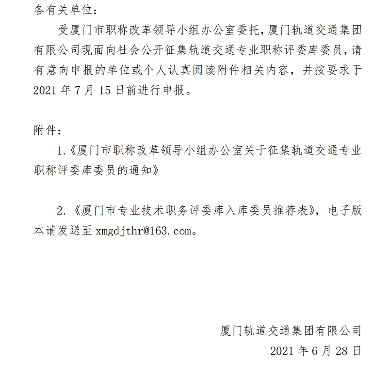 关于转发《厦门市职称改革领导小组办公室关于征集轨道交通专业职称评委库委员的通知》