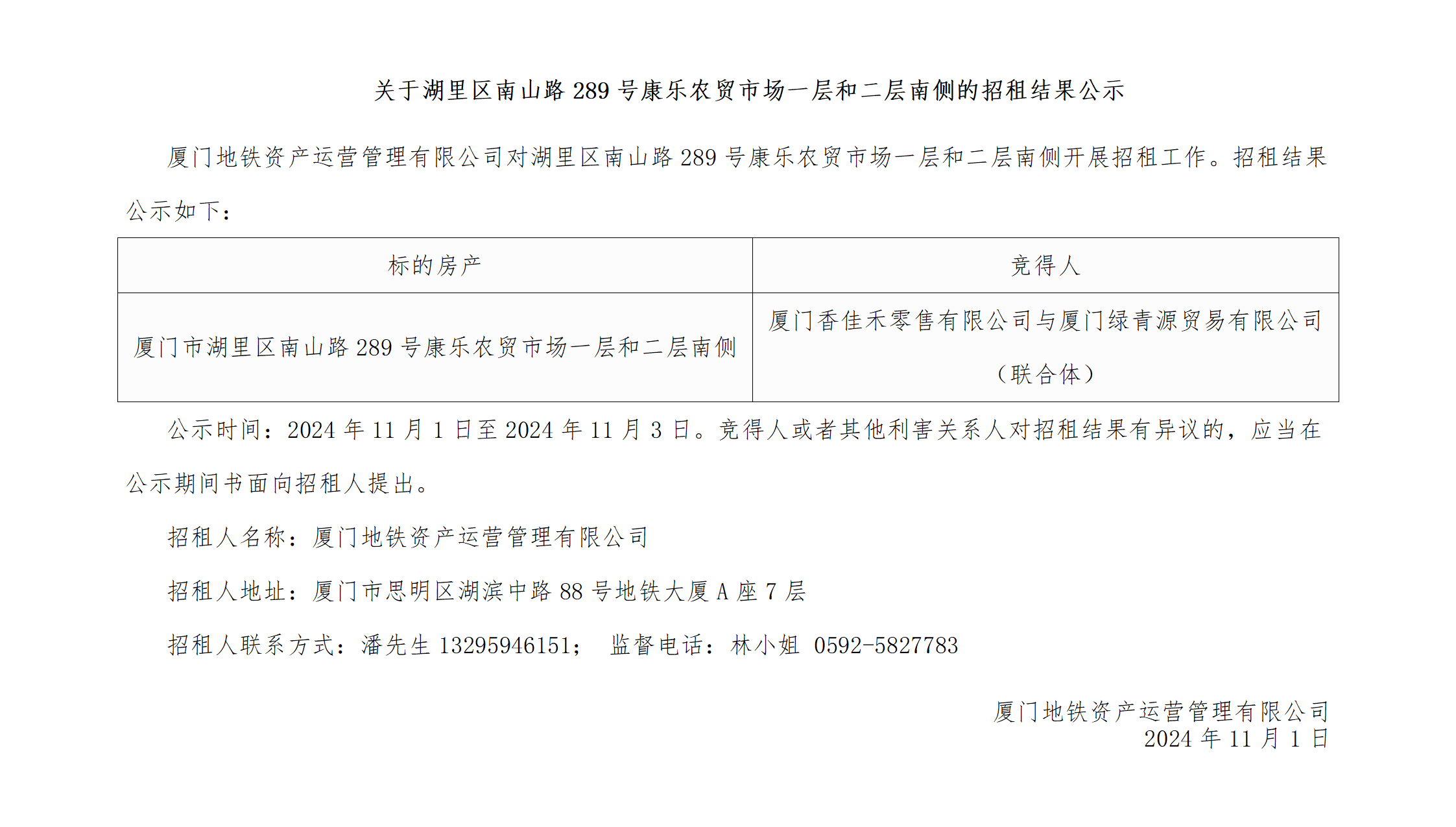 关于湖里区南山路289号康乐农贸市场一层和二层南侧的招租结果公示
