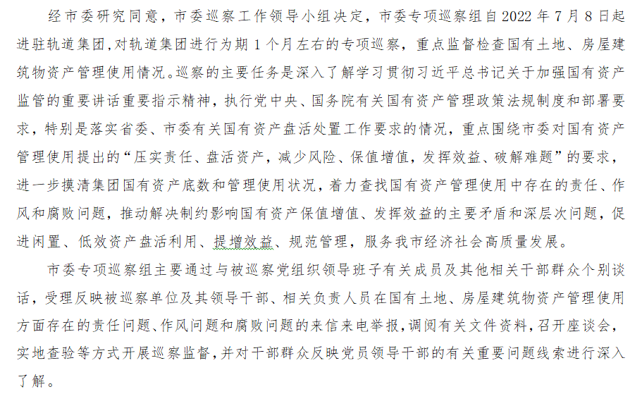 市委专项巡察组进驻轨道集团开展国有资产管理使用情况专项巡察