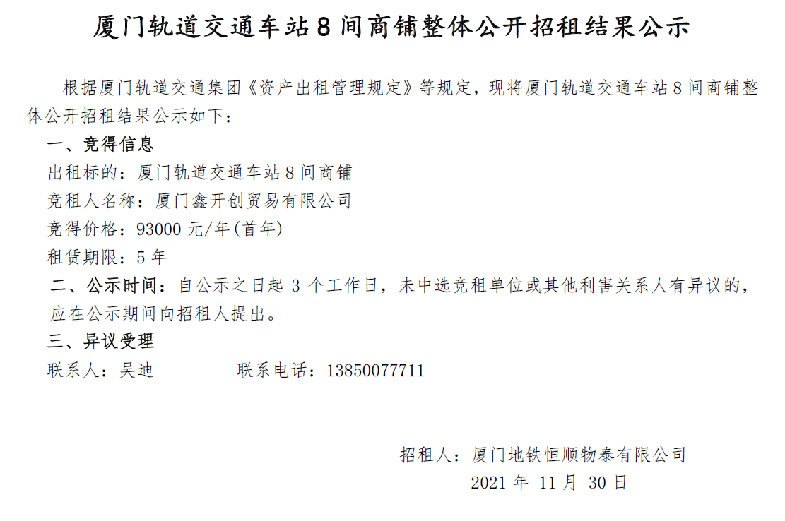 厦门轨道交通车站8间商铺整体公开招租结果公示