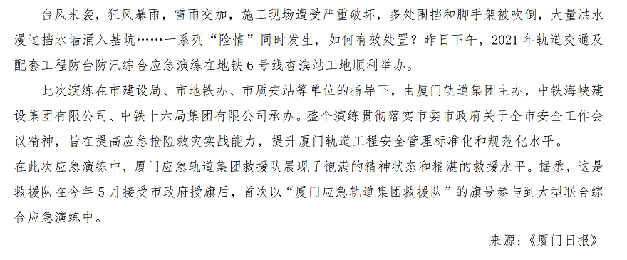 【厦门日报】:提高应急抢险救灾实战能力——地铁6号线举行防台防汛综合应急演练