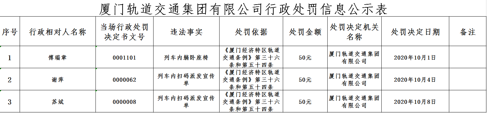 厦门轨道交通集团有限公司行政处罚信息公示(2020.10.10-2020.10.16)